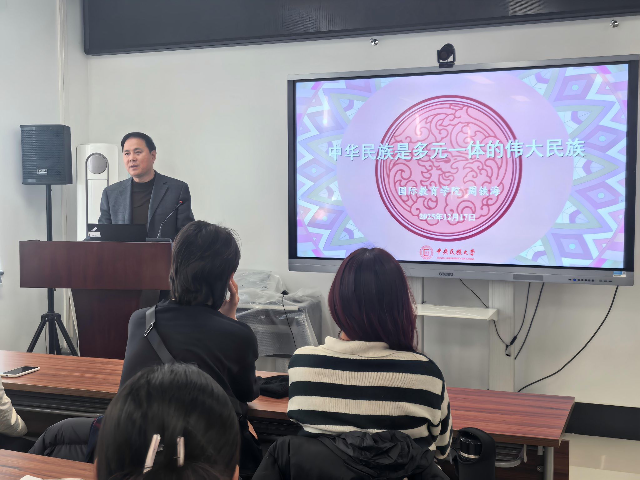党委书记周铁海为来自20多个国家的60多名本科生、研究生和语言进修生新生作题为“中华民族是多元一体的伟大民族”的中国国情教育讲座。讲座在成人导航
